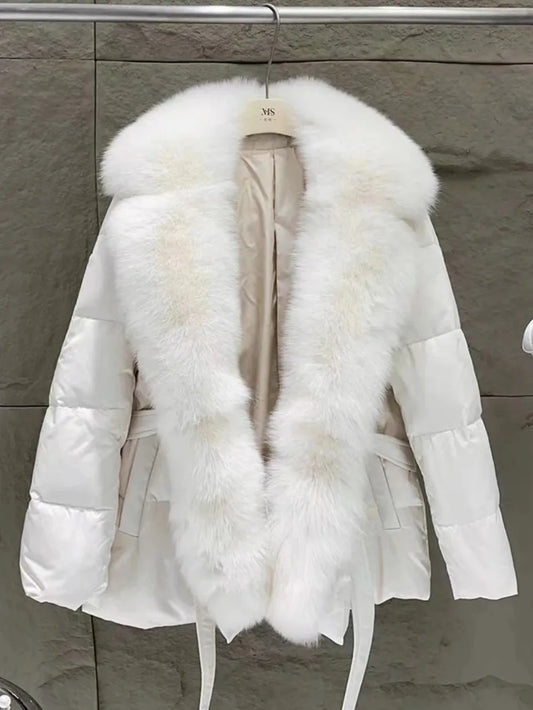 2024 Winter New Luxury Natural Fox Fur Collar White Goose Down Jacket Women Warm Parkas Slim Coat with Belt Outwear Female