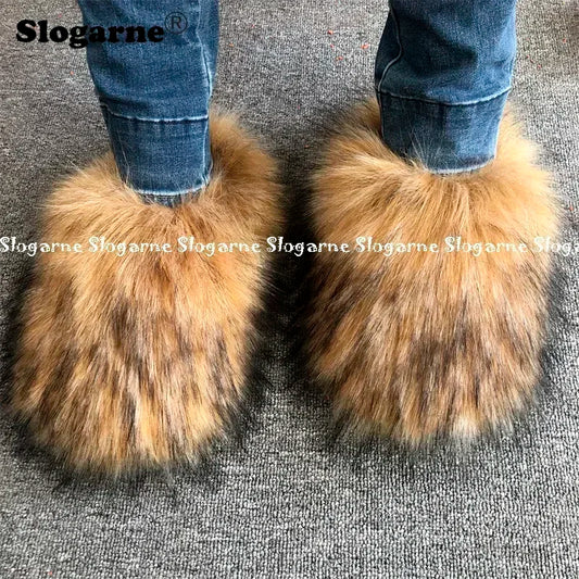 New Colorful Raccoon Fur Slippers Women Winter Faux Fur Shoes Ladies Luxury Furry Slippers Girls Artificial Fox Furs Slides Shoe