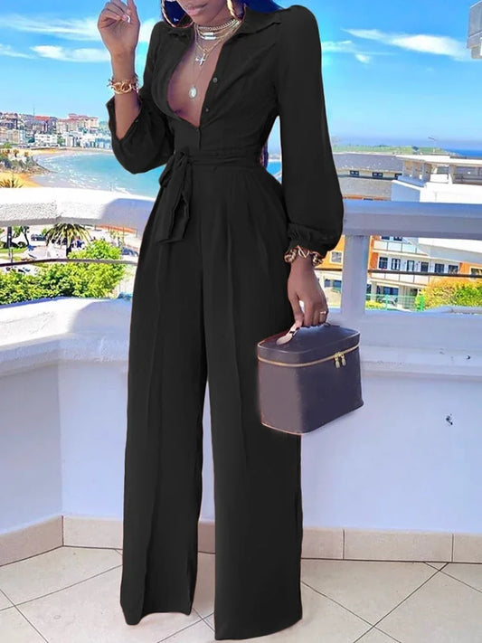 New Fashion Casual Jumpsuit for Women Spring Summer Solid Color Lace Up Shirt Collar Two-Piece Suit Jumpsuits Office