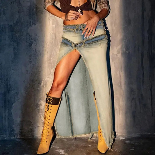 New Irregular Design Spicy Girl Denim Skirt for Women Washed and Distressed Light Blue Fake Two Piece Patchwork Fur Button Skirt