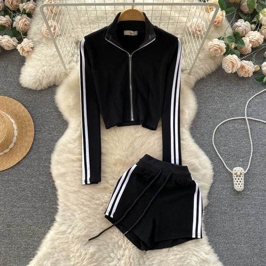 Spring Summer Stripes Zipped Stand Collar Casual Sports Suit