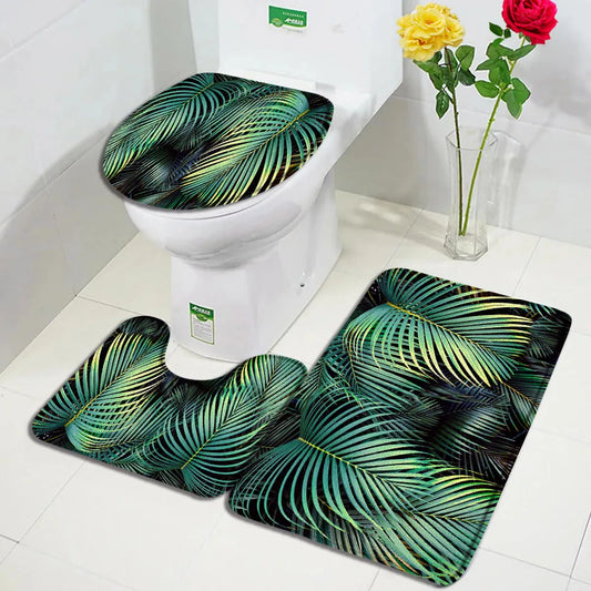 Tropical Leaves Bath Mat Set Green Palm Leaf Monstera Black Carpet Home Bathroom Decor Non Slip Rugs U-shaped Toilet Lid Cover