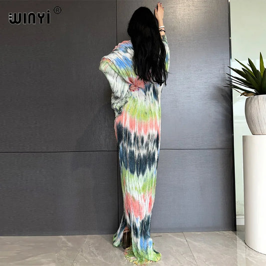WINYI fashion print summer V-neck Knitted hollow sexy long dress Elegant party Evening dress Women Beachwear long sleeve dress