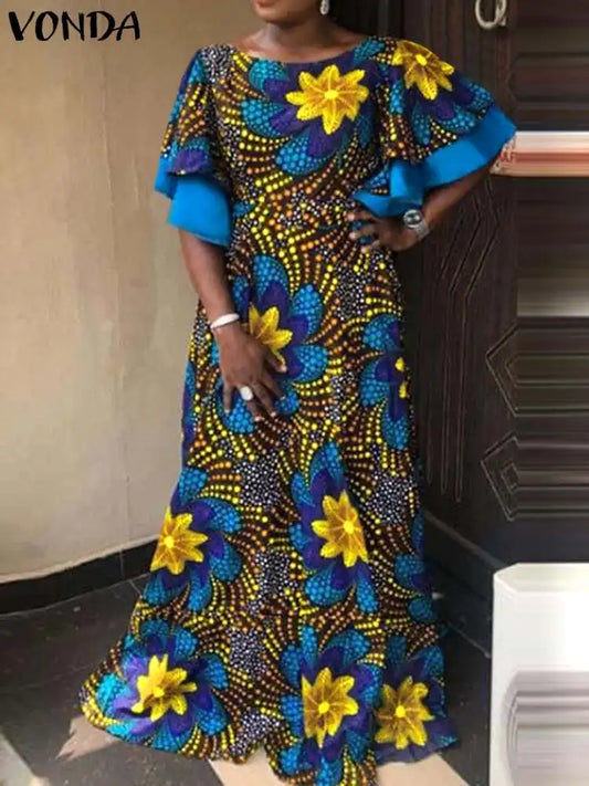 Women Maxi Dress 2023 VONDA Elegant Fare Sleeve Summer Dress Bohemian Solid Color Turtleneck Sundress Fashion Vestido Oversized