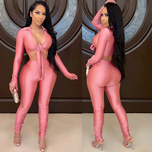 Women's Fashion Casual Slim Fit Two-Piece Set Open Shirt Butterfly Knot Long Sleeve Top with Long Pants Eye-Catching Streetwear