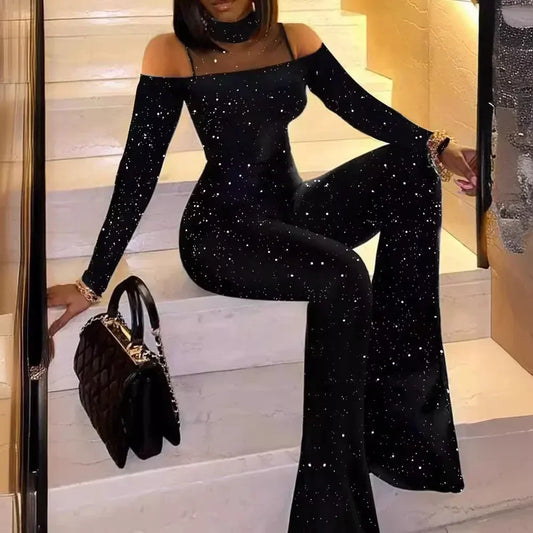 Women's Clothing Grid Stitching Jumpsuit Full Length Flare Pants Playsuit High Waist