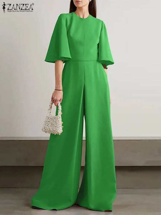 ZANZEA 2024 Summer Elegant Women Jumpsuits Overalls Ruffled Half Sleeve Long Rompers Office Commuting Wide Leg Pants Playsuits