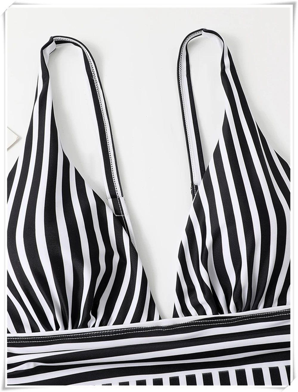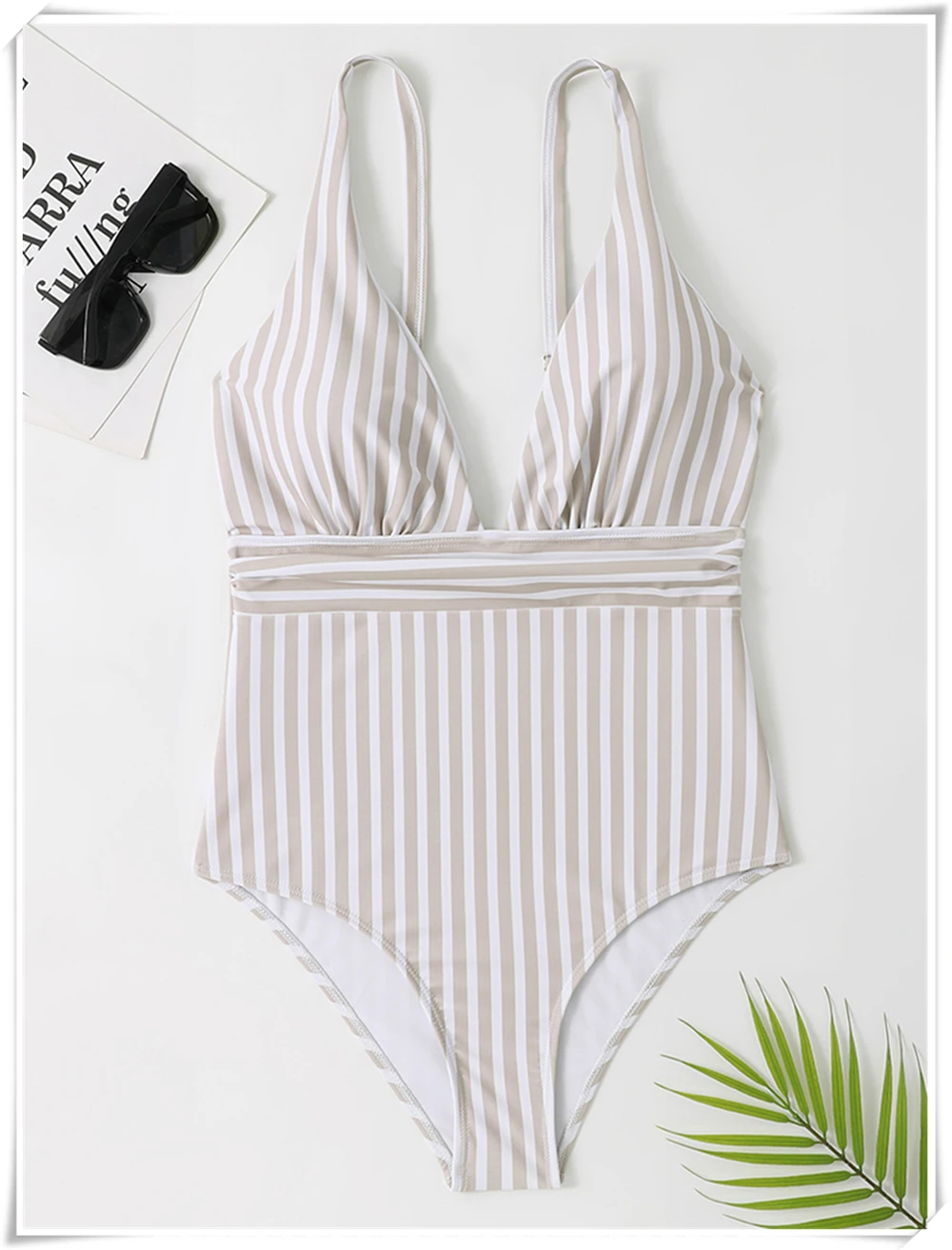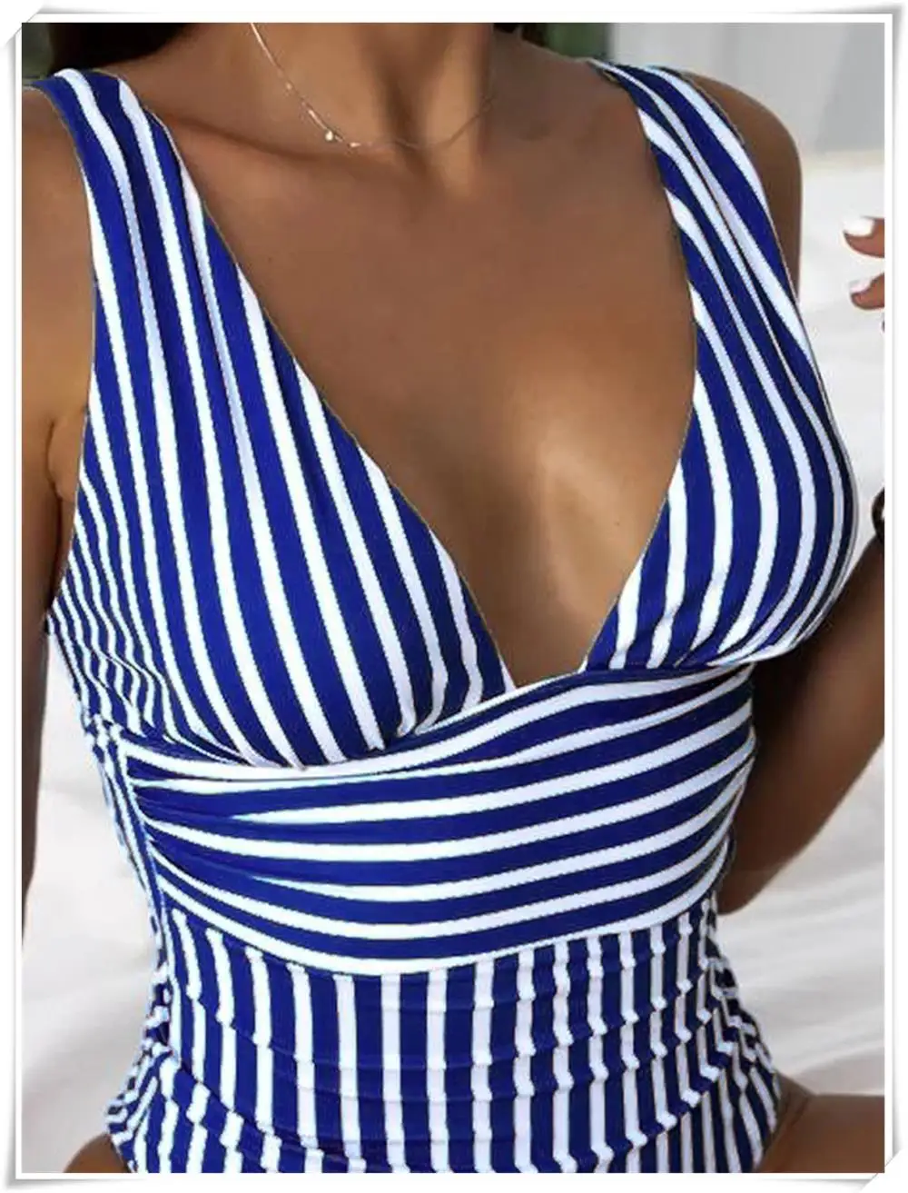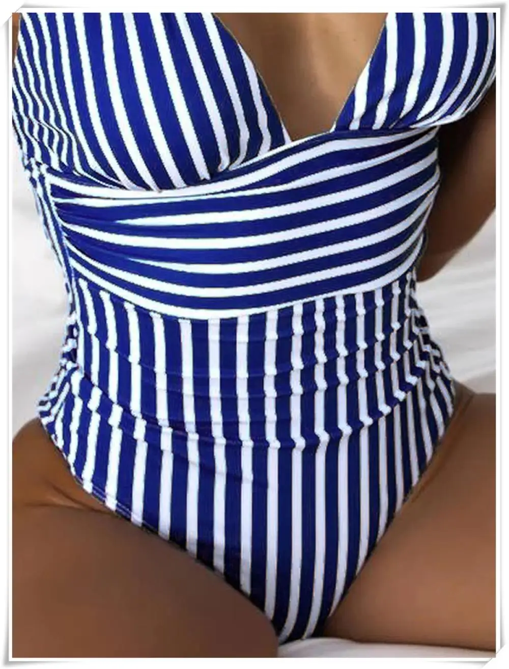 Striped V-neck One Piece Swimsuit Vintage Padded Swimwear Women Bathing Swimming Suit Female Backless Beachwear Bodysuit
