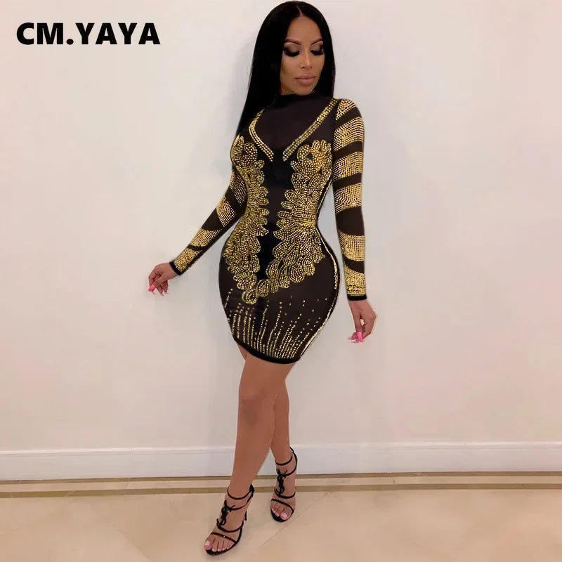 CM.YAYA Hot Rhinestones Patchwork Mesh Midi Bodycon Dress Women Sexy Club Party Nightwear Long Sleeve Mini Dresses