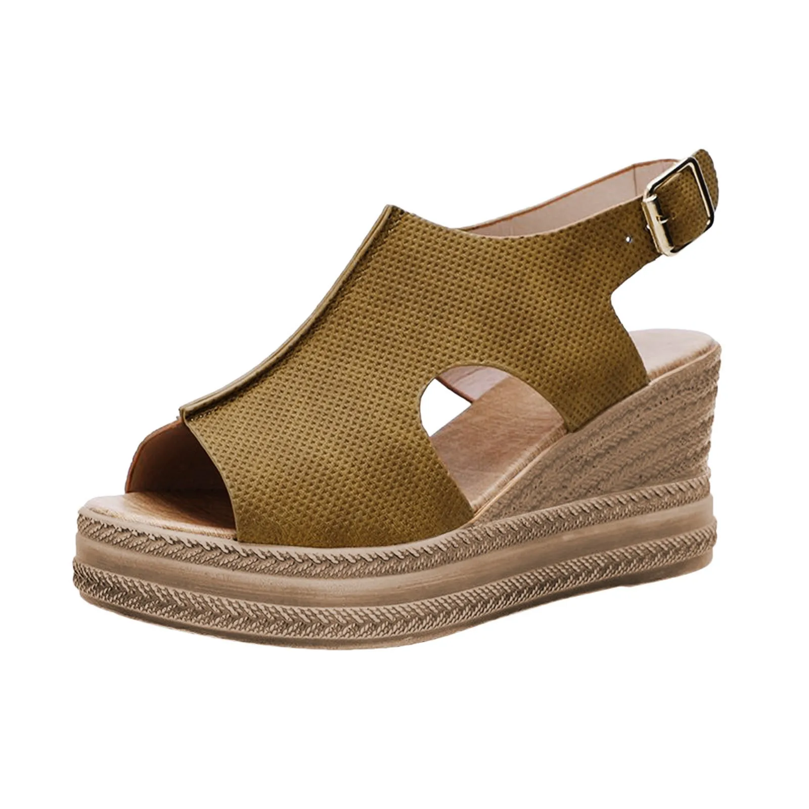 Ladies Fashion Solid Color Hollow Out Leather Open Toe Buckle Wedge Heel Sandals