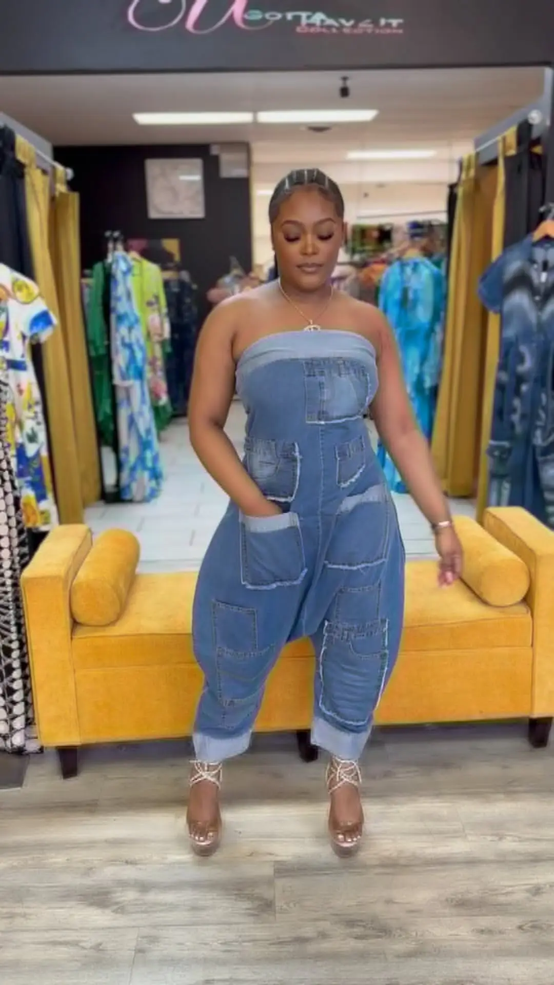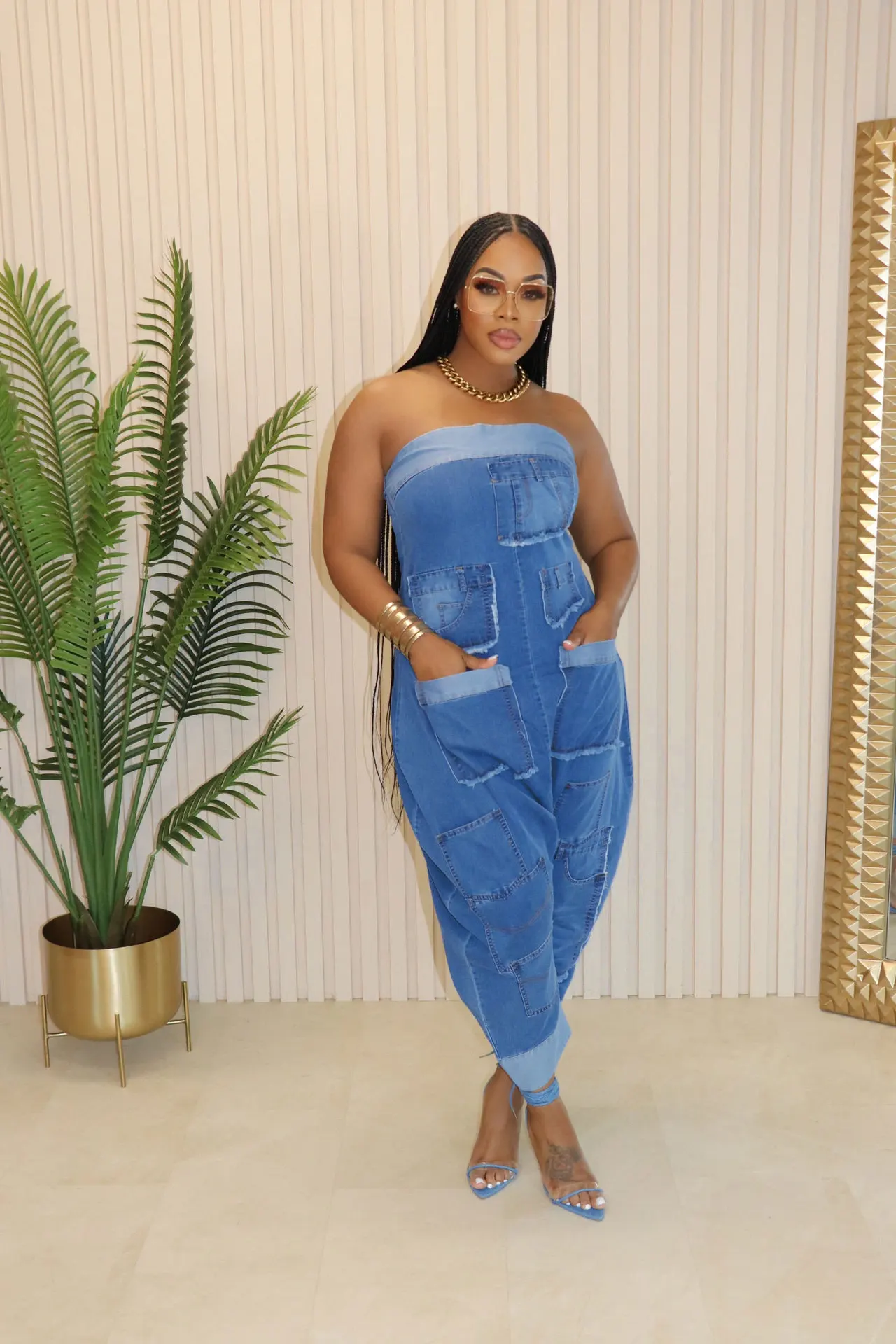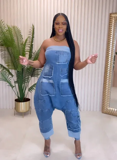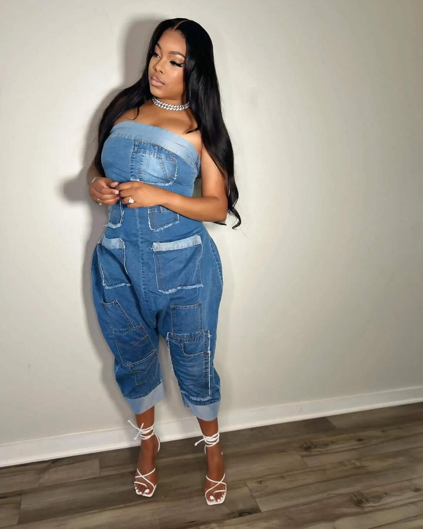 Women Strapless Sleeveless Pockets Cargo Wide Leg Denim Jumpsuits 2024 Washed Oufits Street One Piece Loose Rompers