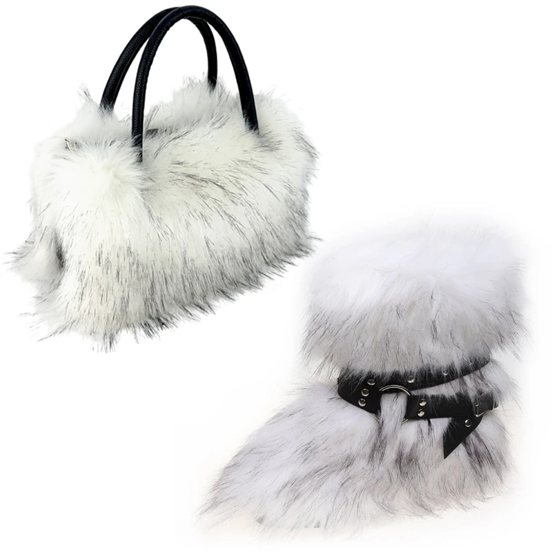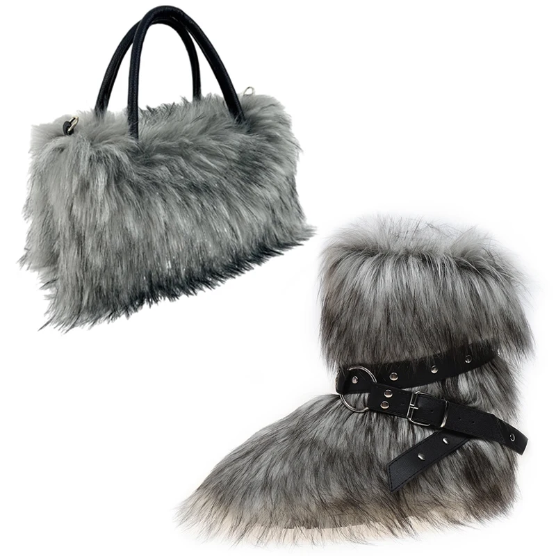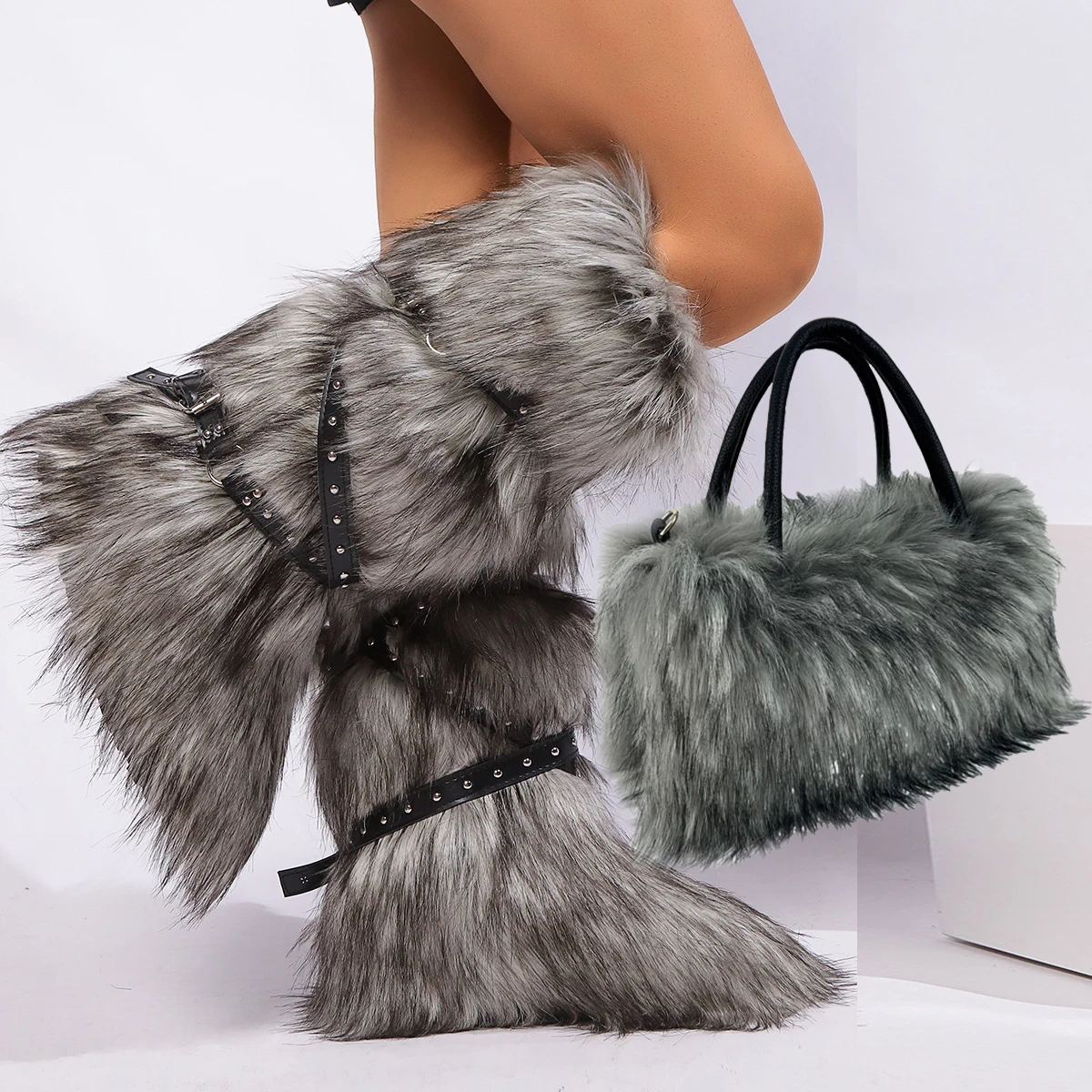 Luxury Cross Belt Buckle Fur Snow Boots Plus Velvet Warm Fur Women's Boots Fashion Imitation Fur Raccoon Hair Handbag Two-piece