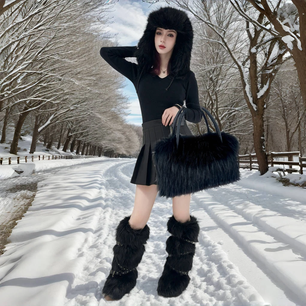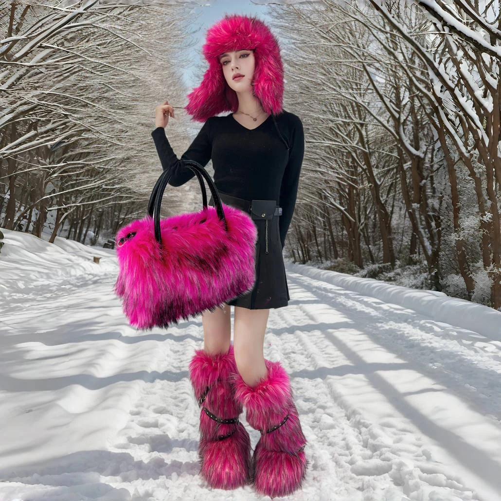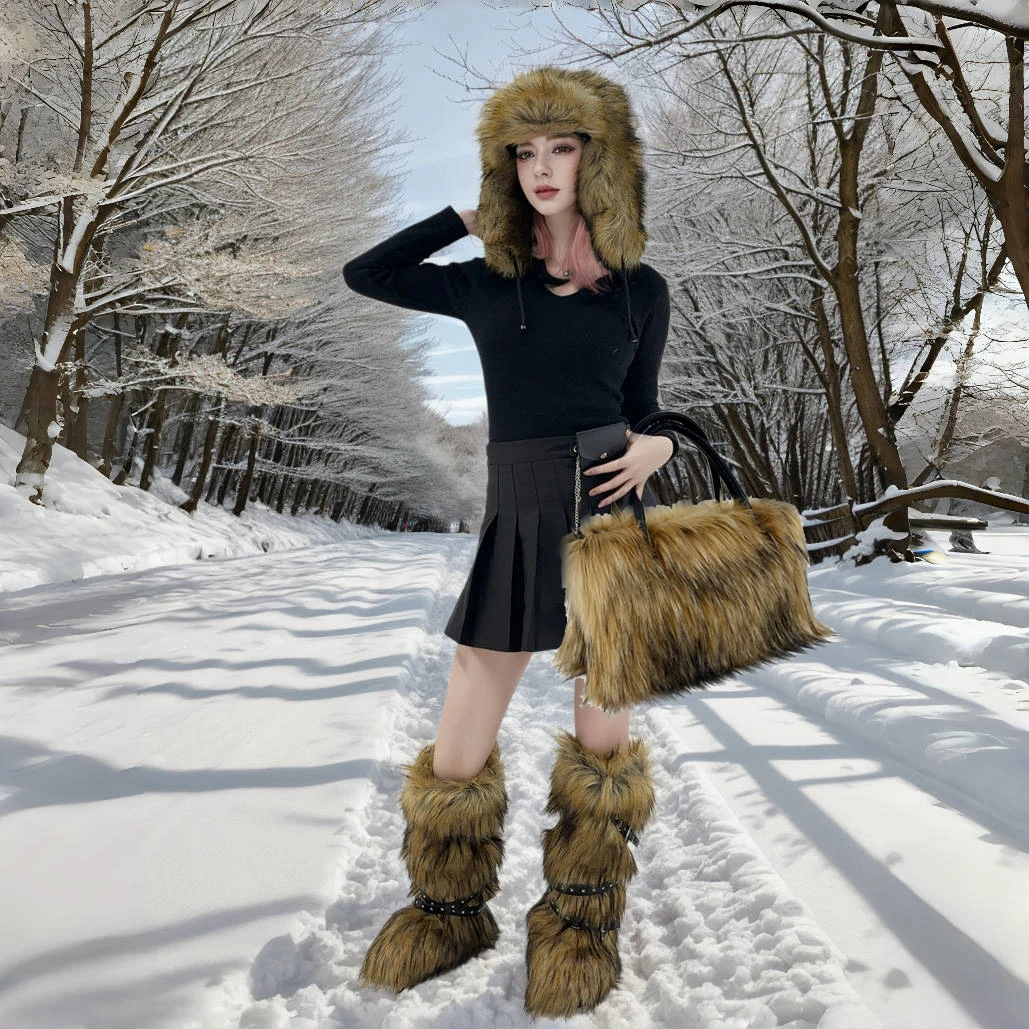 Women's Luxury Velvet Warm Fur Snow Boots Mid-Calf Imitation Raccoon Hair Handbag Two-Piece Set Fashionable Faux Fur Booties